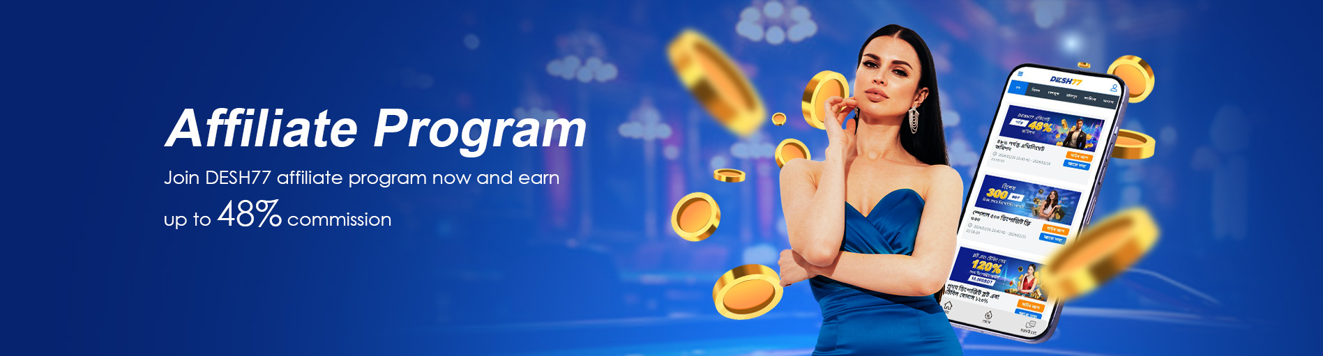 DESH77 অ্যাফিলিয়েট প্রোগ্রাম হল একটি আন্তর্জাতিক অংশীদারিত্ব প্রোগ্রাম, যেখানে আমরা আপনাকে গ্রাহকদেরকে DESH77-এ রেফার করার মাধ্যমে প্রতি মাসে অনলাইনে অর্থ উপার্জন করার সুযোগ দিই। শুরু করুন এবং আজই আপনার খেলোয়াড়ের বাজি ক্রিয়াকলাপের উপর ভিত্তি করে লাইফ টাইম কমিশন উপার্জন করুন!